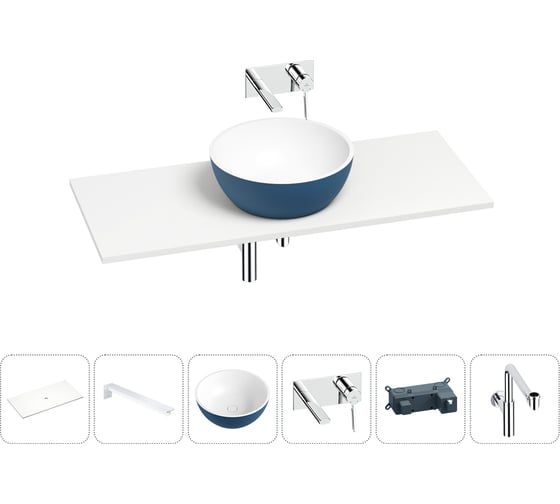Раковина-столешница Wellsee La.lune в наборе 6 в 1: каменная раковина матового темно-синего/матового белого цвета, столешница 100 см, кронштейны, смеситель, сифон 202007779