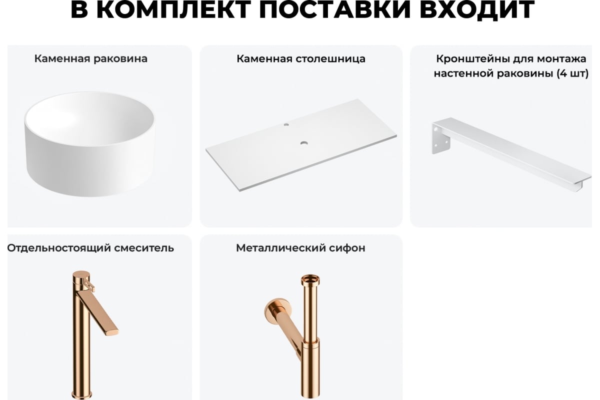 Раковина-столешница Wellsee Le.charme в наборе 5 в 1: каменная раковина со столешницей 120 см в матовом белом цвете, кронштейны для подвесного монтажа, смеситель и сифон (розовое золото) 202002596