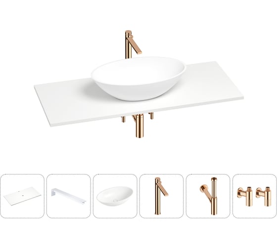 Раковина-столешница Wellsee Le.huit.mars в наборе 6 в 1: каменная раковина со столешницей 100 см, кронштейны для подвесного монтажа, смеситель, сифон, вентили (цвет набора розовое золото) 202002731