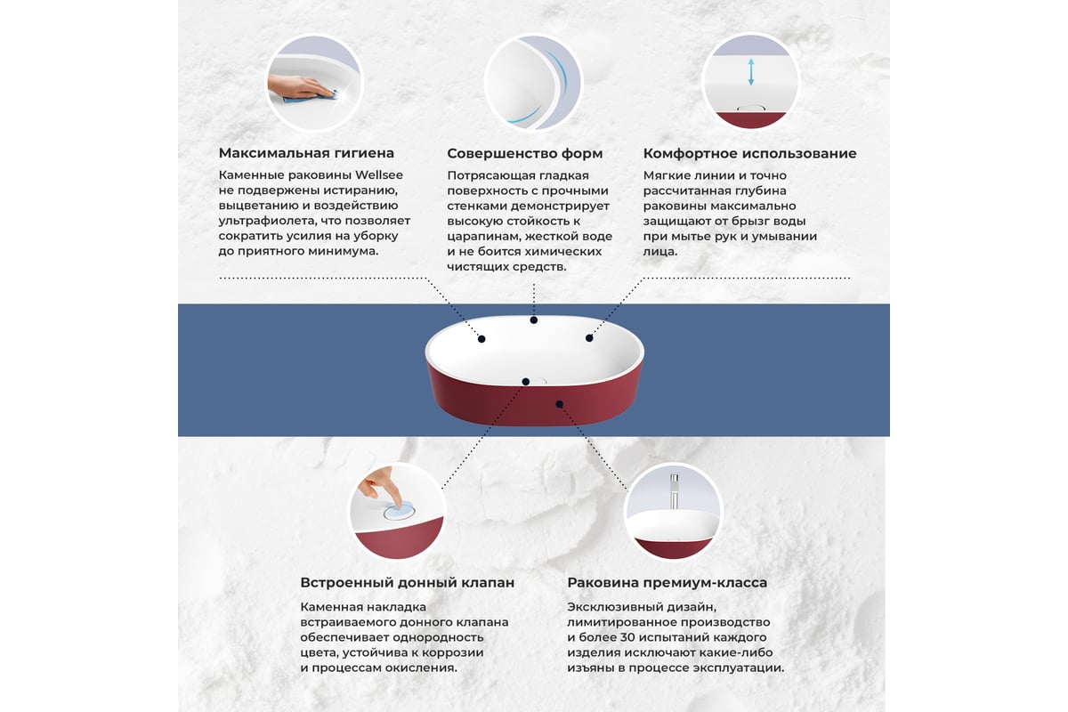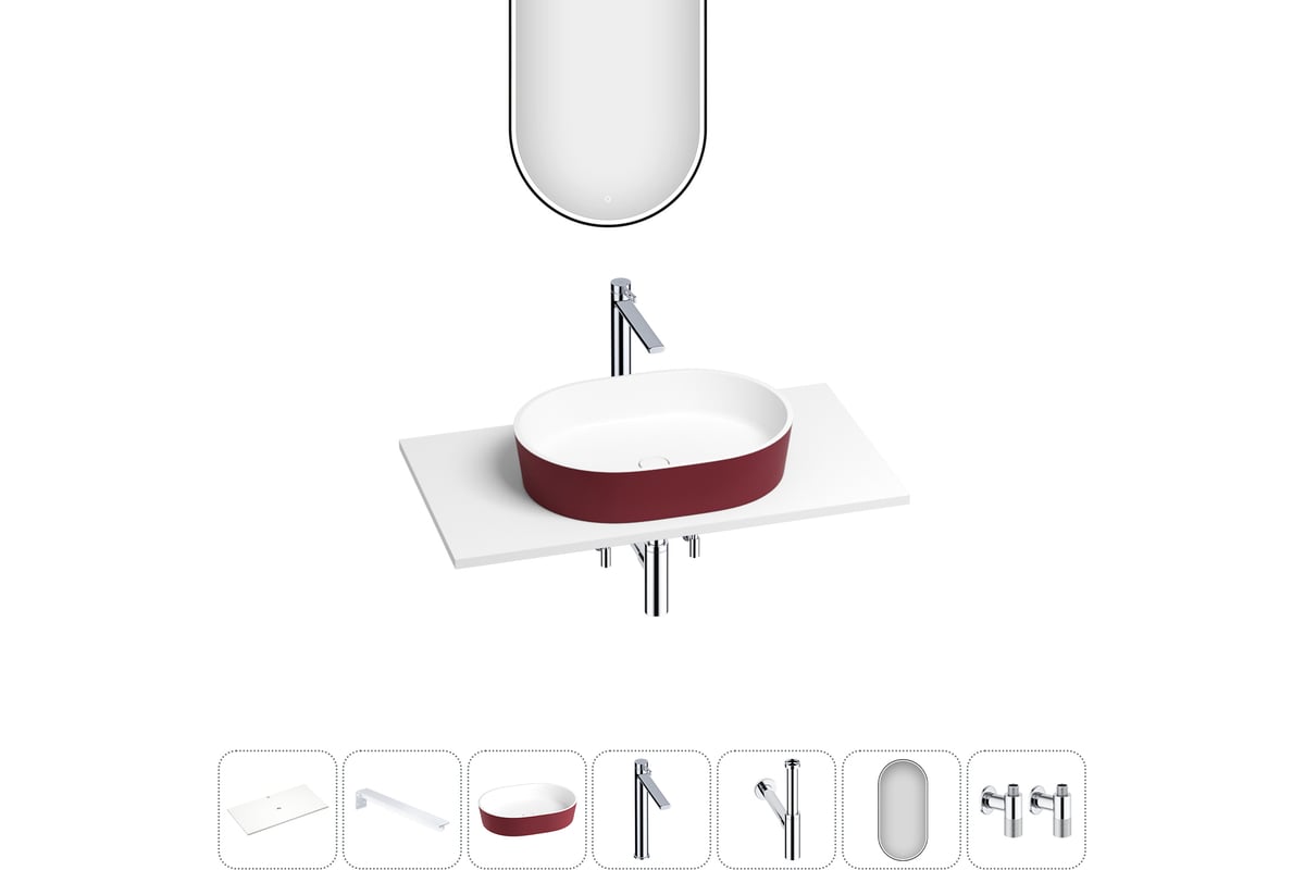 Раковина-столешница Wellsee Le.premier набор 7 в 1: каменная раковина матового пурпурно-красного/матового белого цвета, столешница 90 см, кронштейны, смеситель, сифон, вентили, зеркало 202006663