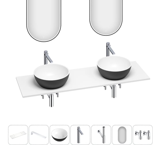 Раковина Wellsee La.lune набор 7 в 1: две раковины из камня с подвесной столешницей 140 см (цвет матовый черный/матовый белый), кронштейны, смесители, сифоны, вентили, зеркала 202006833