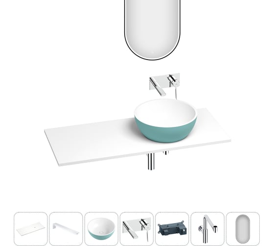 Раковина Wellsee La.lune набор 7 в 1: раковина из камня с подвесной столешницей 120 см (цвет матовый бирюзовый/матовый белый), кронштейны, смеситель, сифон, зеркало 202008111