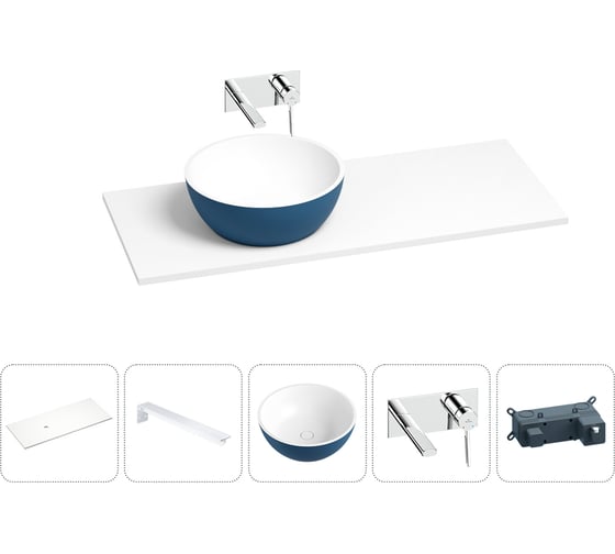 Раковина Wellsee La.lune в наборе 5 в 1: раковина из камня с подвесной столешницей 100 см (цвет матовый темно-синий/матовый белый), кронштейны, смеситель 202007472