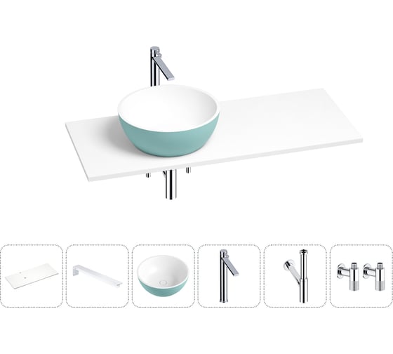 Раковина Wellsee La.lune в наборе 6 в 1: раковина из камня с подвесной столешницей 100 см (цвет матовый бирюзовый/матовый белый), кронштейны, смеситель, сифон, вентили 202006565