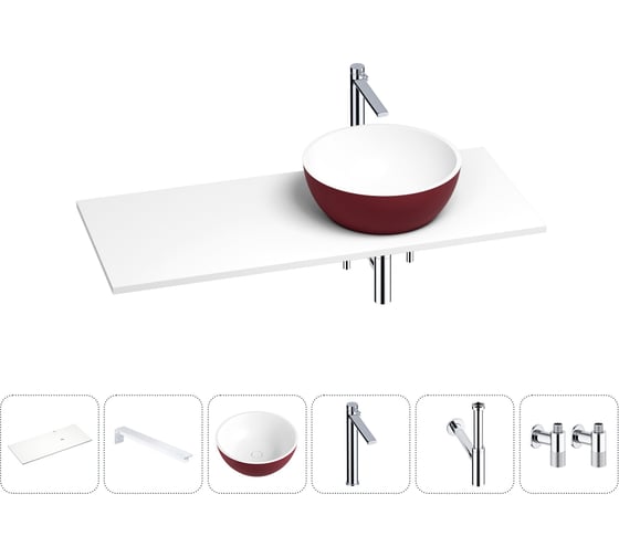Раковина Wellsee La.lune в наборе 6 в 1: раковина из камня с подвесной столешницей 100 см (цвет матовый пурпурно-красный/матовый белый), кронштейны, смеситель, сифон, вентили 202006532