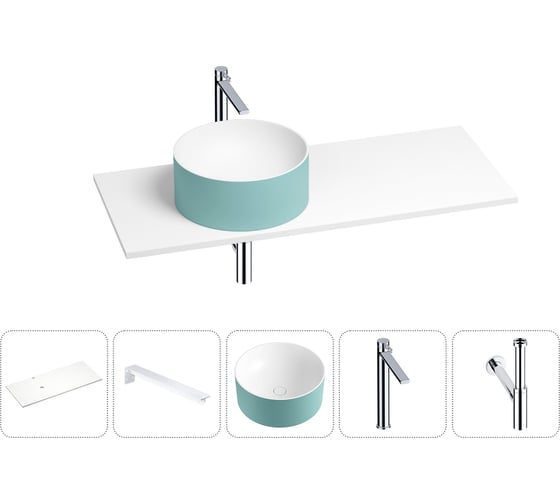 Раковина Wellsee Le.charme в наборе 5 в 1: раковина из камня с подвесной столешницей 100 см (цвет матовый бирюзовый/матовый белый), кронштейны, смеситель, сифон 202006325