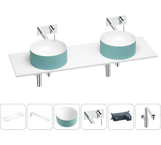 Раковина Wellsee Le.charme в наборе 6 в 1: две раковины из камня с подвесной столешницей 120 см (цвет матовый бирюзовый/матовый белый), кронштейны, смесители, сифоны 202007872