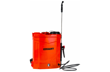 Аккумуляторный опрыскиватель Gigant используется в садоводстве для равномерного орошения растений и обработки удобрениями, в быту для мытья стен и машин. Инструмент оснащен 12 В аккумулятором, поэтому обеспечивает мобильность, с ним можно работать в поле, не привязываясь к наличию розетки и электросети. Бак вмещает 16 литров жидкости, длина шланга - 1,5 метра.