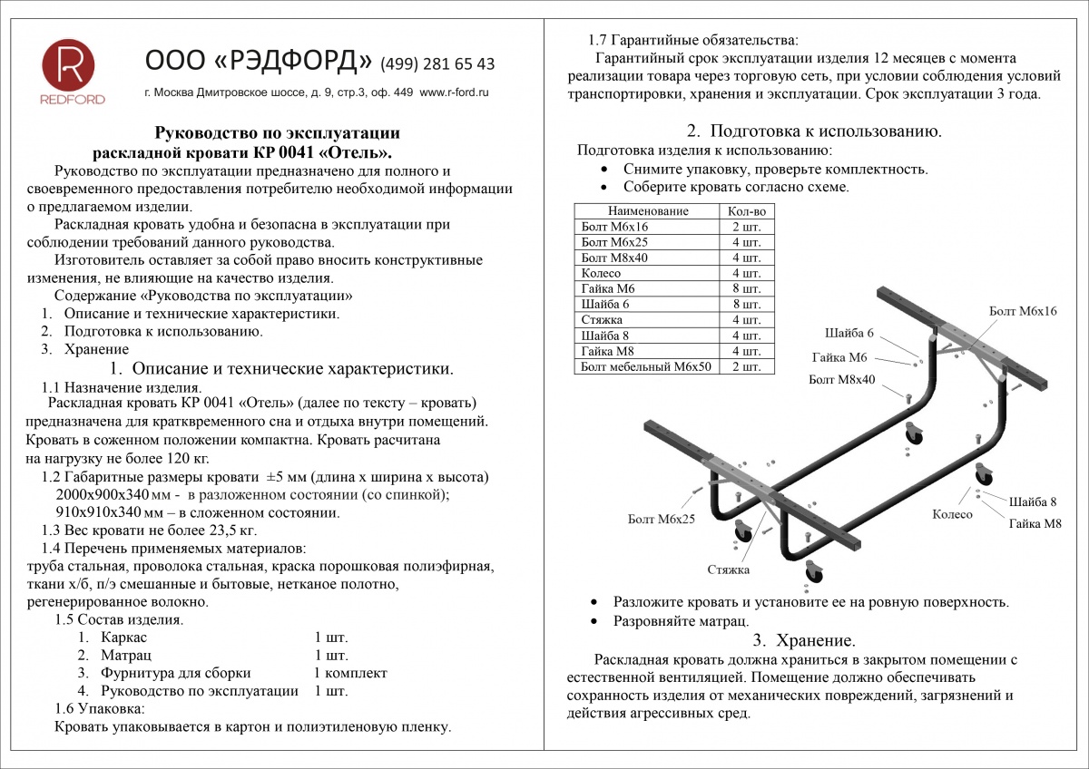 Для фиксации в сложенном виде к кровати складной прилагается лента-контакт (липучка). Внимание! Перед эксплуатацией требуется сборка: необходимо установить изголовье, колесики и стяжки