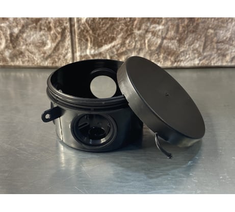 Габариты 65мм диаметр и 40мм высота - только для коробки без крышки! С закрытой крышкой диаметр 73 мм и высота 44 мм. Между концами мягких уплотнителей кабеля, установленных в коробку на противоположных сторонах, 85мм (но их можно вмять или поставить выступом внуть).