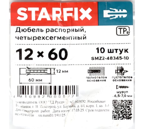 Вопросы и ответы о четырехсегментном распорном дюбеле STARFIX 12x60 мм 10 SMZ2-48345-10
