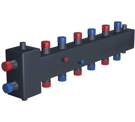 Коллектор с гидрострелкой на 6 контуров Т-образная является гидравлическим разделительным узлом, который совмещен в единую конструкцию с коллектором модульного типа.