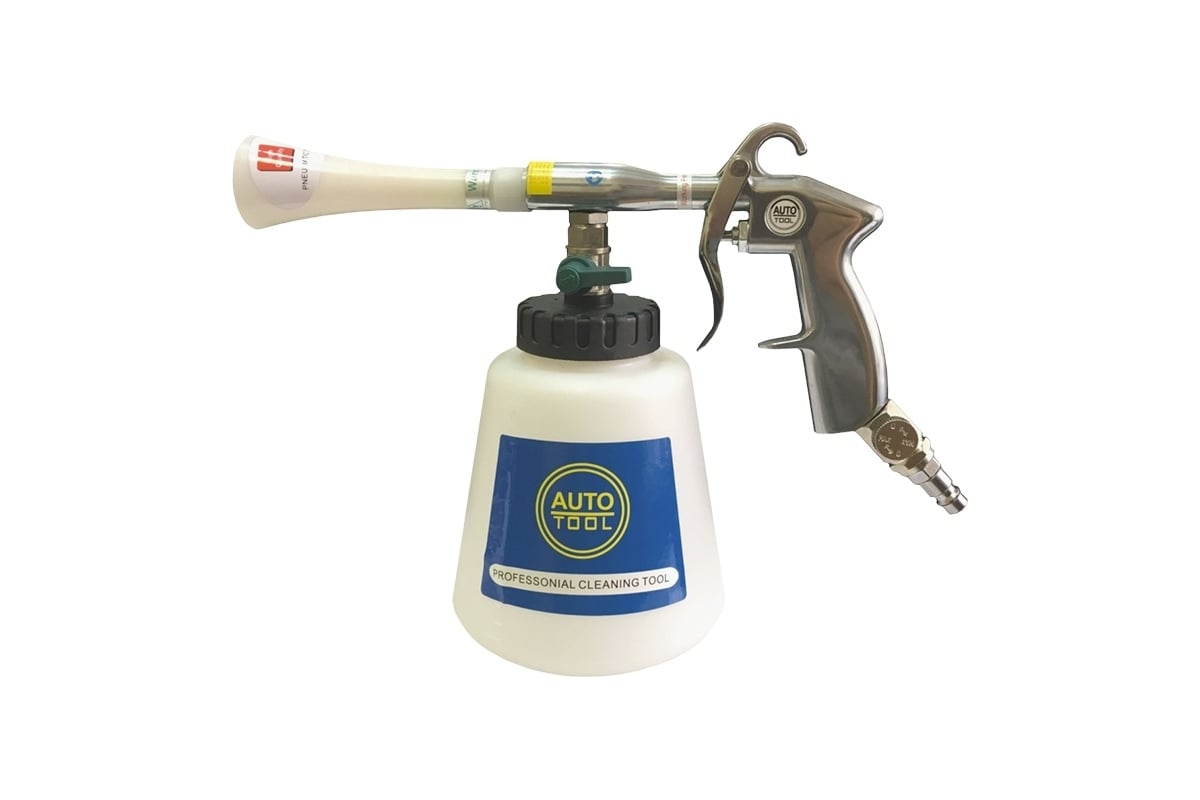 Работает за счет сжатого воздуха, распыляя его и моющее средство под высоким давлением. На выходе из распылителя воздух с моющим средством вращается по траектории спирали. Это создает так называемый «торнадо-эффект», который с большой силой эффективно удаляет грязь с обрабатываемой поверхности.