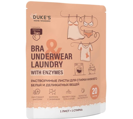 Растворимые листы для стирки нижнего белья и деликатных вещей DUKE'S HOME WONDERS Duke's аромат персик, 20 шт. DS026
