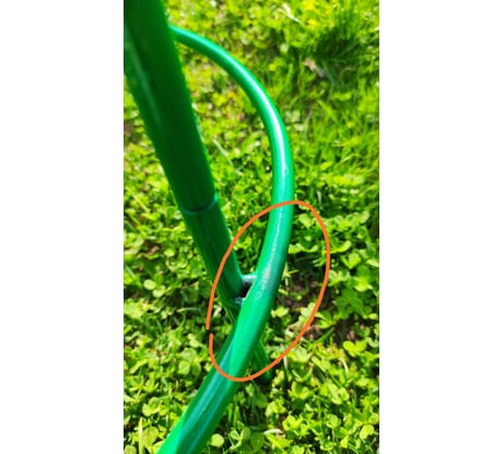 При сборке понадобились небольшие усилия, хоть отверстия и направляющие подогнаны четко. Контроль после покраски, видимо не проводился(упаковка-пленка без повреждений) : есть непрокрас и задиры. Нижний круг упирается в землю для устойчивости - думаю быстро сгниет. Сварка произведена без прижатия деталей друг к другу