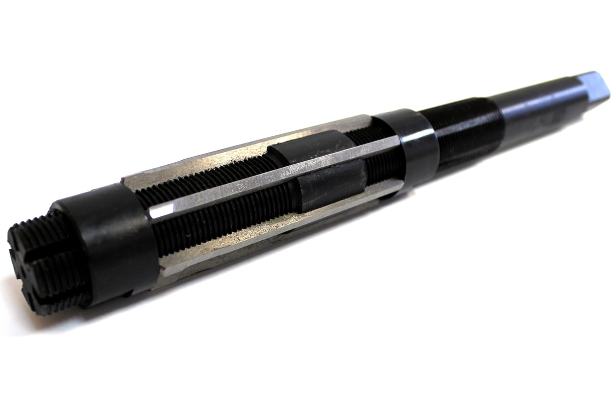 Регулируемая развертка используется с целью получения более точного отверстия по диаметру. Процесс регулировки диаметра развертки прост и производится при помощи обыкновенного гаечного ключа. На регулируемой развертке имеются две гайки – верхняя и нижняя. Сначала откручивается верхняя гайка, а затем, перемещая нижнюю гайку, регулируют диаметр – чем сильнее затягивается нижняя гайка, тем больше получается диаметр. Таким образом, размер регулируемой развертки можно изменить в диапазоне от 1 до 3 мм. Инструмент выполнен из качественной быстрорежущей стали марки 9ХС, благодаря чему отличается прочностью и долговечностью.