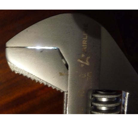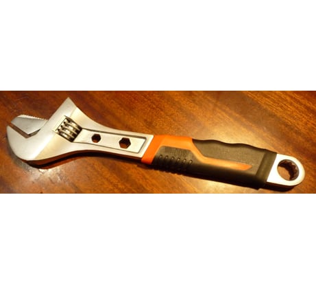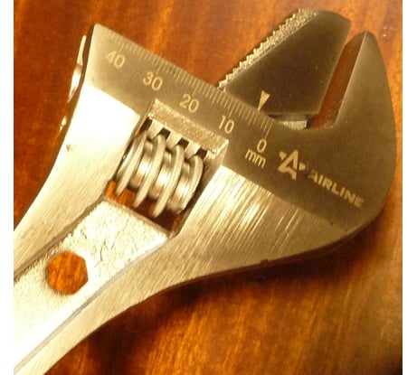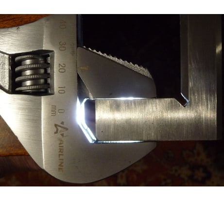 Ключ не соответствует фото, что на витрине сайта. Он по факту со съемной губкой. Люфт подвижной части и продольный, и поперечный 0,5мм. Ход нормальный, без заеданий. Толщина подвижной губки 12,2-15,5мм, на её рабочей поверхности, как обычно у китайцев, заусенцы, они их видимо презирают, т.к. совершенно не обращают внимание на их наличие. Параллельность губок отсутствует, зазор прим.0,33мм у пятки. Маркировка шкалы краской. Раздвигается ключ на 42мм ( при захвате в 3 витка). Губка съемная, т.е. её можно переворачивать для возможности зажима трубы. Есть калиброванные отв под S 9, 11, 17.
