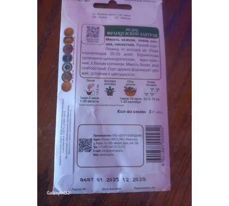 Хорошая семена спок годности до 28года , вытянутая форма очень выгодная , удобно и вытаскивать и нарезать на вкус так же хорошая редиска
