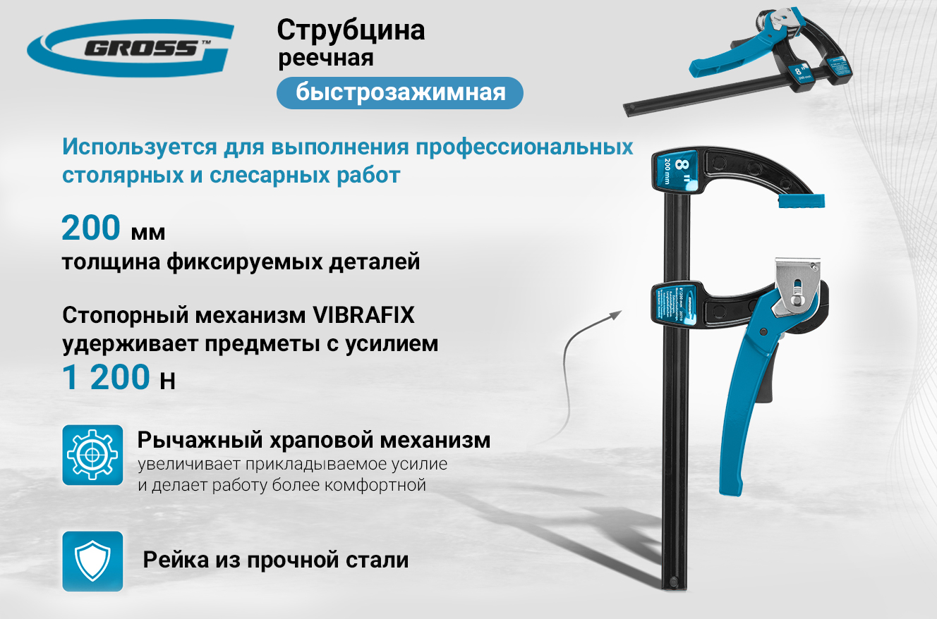 Реечная быстрозажимная струбцина, металлический корпус,рычажный храповый механизм, 8"/200 мм GROSS 20719
