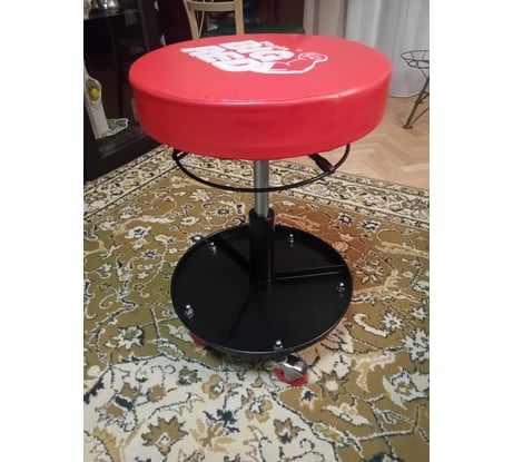 Круглый мягкий табурет на регулируемом (ход 120 мм) пневмо-амортизаторе и 4х колесах, с квадратной инструментальной полкой для мелочей.