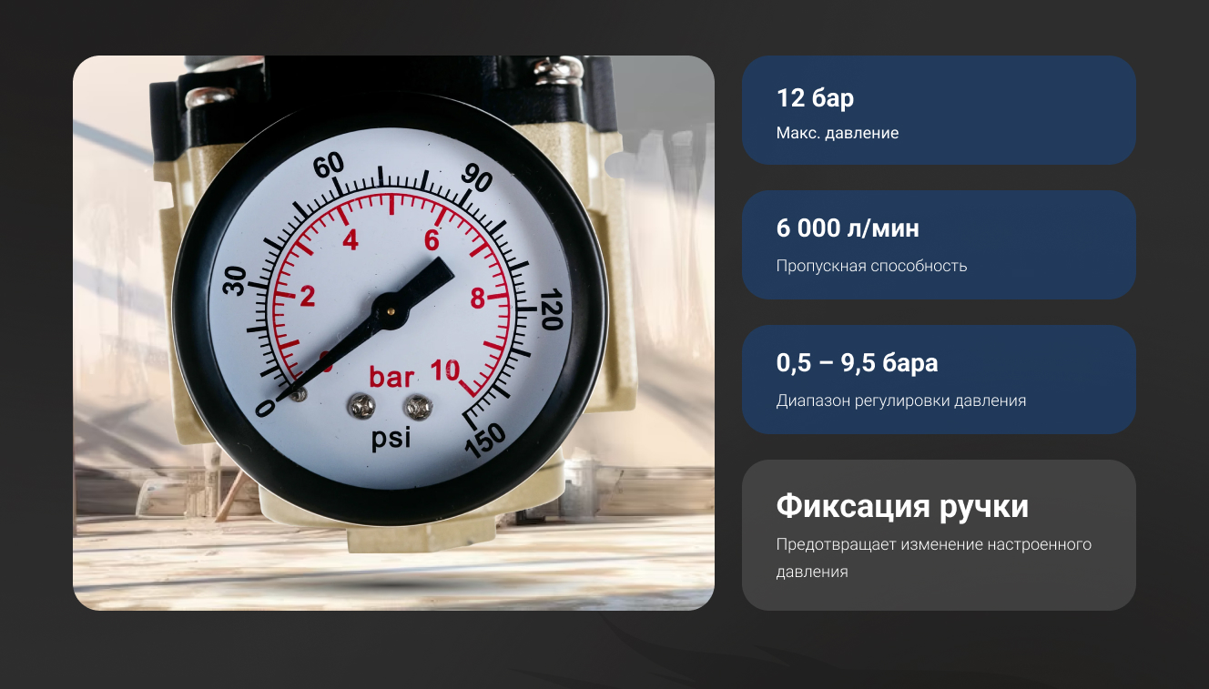 - Диапазон регулирования давления: 0,5-9,5 бар