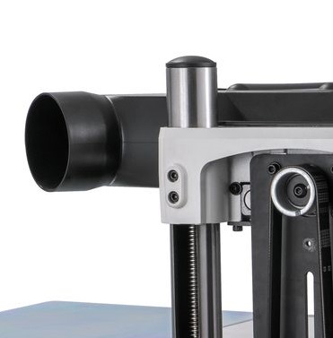 Привод с поликлиновым ремнем расположен внизу корпуса. Съемный кожух пылеудаления упрощает очистку станка от стружки, удаление смолы и замену лезвий.
