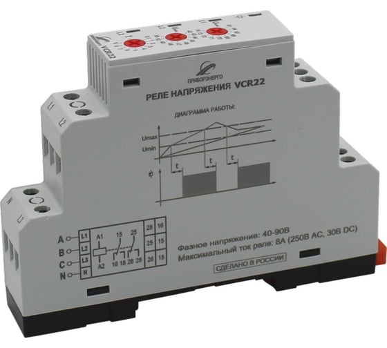 Реле контроля напряжения VCR22, выпускаемое компанией НТК «Приборэнерго», представляет собой устройство защиты электрооборудования, предназначенное для контроля уровня напряжения в трёхфазной сети. Оно отключает нагрузку при выходе напряжения за установленные пределы — как при повышенном, так и при пониженном напряжении, что позволяет предотвратить повреждение чувствительного оборудования.