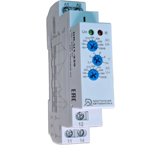 Реле контроля напряженияDR-U1-220 имеет диапазон измеряемого напряжения 160-270В AC, а также номинальный ток контактов 10А при напряжении 250В AC/24В DC.Реле напряженияDR-U1-220 имеет крепление на DIN-рейку и габаритные размеры однополюсного автомата. Реле контроля напряжения DR-U1-220 имеет два светодиодных контакта: Un определяет наличия питающего напряжения, а индикатор R сигнализирует о срабатывании контактов реле.