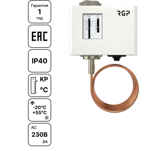 Реле температуры (капиллярный термостат) в корпусе из стали c пластиковой крышкой и газонаполненным капилляром из медной трубки применяется для регулирования температуры в системах отопления, вентиляции и кондиционирования. Основной функцией капиллярного термостата является защита вентиляционной установки от замораживания в зимний период. Термостаты производятся в Китае по заказу RGP и отличаются простотой настройки и надежностью в эксплуатации. Длина капиллярной трубки выбирается при заказе и составляет от 1 до 11,5 метров. Термостат защиты от замораживания сигнализирует о срабатывании с помощью перекидного контакта SPDT. Степень защиты корпуса IP30.