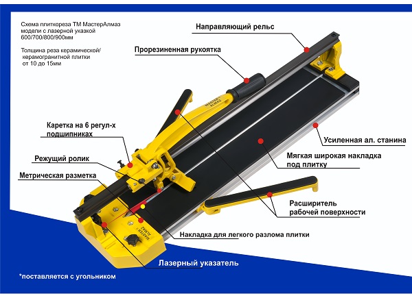 Лазер врёт, через месяц работы начал ломать плитку а не резать. Ручка прогнулась и резать стало не удобно. Лучше доплатить и взять диам про, вот машинка так машинка