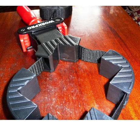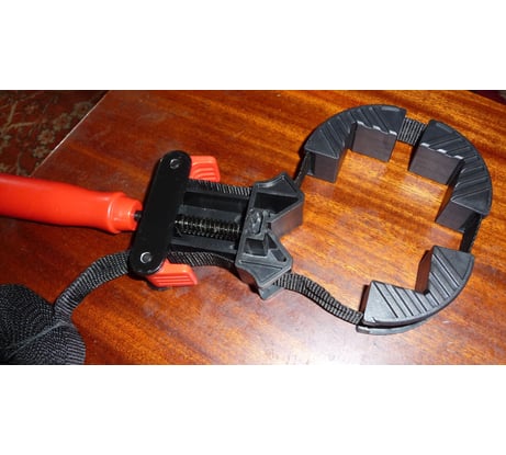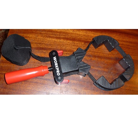 Снова, двойственное впечатление. Особенно обратная, скрытая упаковкой сторона. Она не должна быть крышкой закрыта? Сам удерживающий узел- гайка и боковые планки скорее силумин. Ремень 24х1,6мм. (в описании 25 и даже 110мм…) Упор и уголки 90градусов. И основной вопрос к упору …наклеена при сборке половинка толщиной 4мм немного сдвинута наружу, т.е. есть ступенька от основной площадки в 0,3мм. Понятно, что для столярных работ это ничто, но это не убирает мнение о качестве изделия и работы персонала фирмы Воркпро.