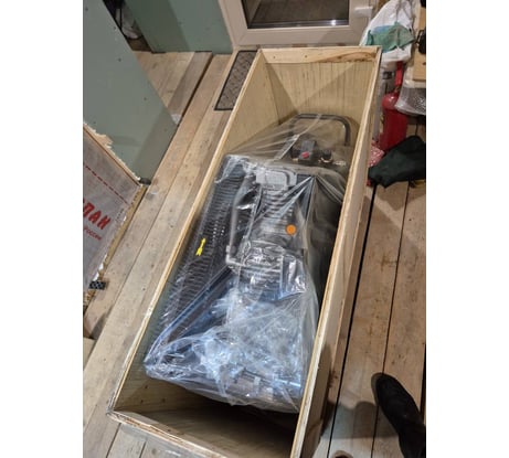 1) Пришёл без коробки, растянут пластиковой лентой на палетту, замотан стретчем, однако повреждений не обнаружил, всё целое. 2) Шнура с вилкой в комплекте нет, торчит совсем коротенький "конец" из прессостата с зачищенными проводниками (медными). Сюрпризом не стало, заранее заготовил провод КГ 4х2,5 кв.мм, вилку трехфазную. Присоединил клеммами Wago (временно), проверил - работает. В дальнейшем придётся колхозить соединение, видимо пайка + изолента. Можно было с завода и вилкой снабдить, в крайнем случае шнур метра 2...3, что бы вилку присоединил и порядок. 3) При работе компрессор не то что "вибрирует" а прямо "прыгает", выглядит диковато. Причём полное впечатление, что прыгает не сам компрессор, а двигатель со шкивом! Чему там прыгать? Сначало подумал что неисправность, но пригляделся - похоже резонанс. Неудачно массы распределили и подобрали местоположение и жесткость опор (колёса и подушки резиновые). Будет время - поэкспериментирую, подложу что нибудь упругое под подушки. 4) У предыдущего компрессора (Fiac масляный однопоршневой с прямым приводом и ресивером 24л) клапан аварийного сброса давления с колечком. Потянул - давление стравил. Тут как то без кольца, как стравливать давление, я не понял. Похоже что никак. Неудобно, я привык. 5) Надеялся что компрессорные цилиндры будут чугунные, тут похоже силумин. Гильзованные внутри, что ли? Не нашёл информацию. 6) Трубки от цилинров в ресивер алюминиевын со стальным оребрением. По хорошему должны быть медные. Надеюсь что хотя бы обмотки двигателя медные, проверить не смог.