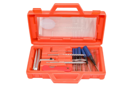 Ремонтный комплект поможет произвести экстренный ремонт шин. В наборе представлены инструменты с витым и с игольчатым наконечником, а также 5 штук жгутов сырой резины длиной 10 см. Для хранения инструментов предусмотрен пластиковый кейс, который весьма удобен при транспортировке. С помощью инструмента c наконечником напильником зачищается место прокола. С помощью инструмента с игольчатым отверстием прокол заделывается жгутом из сырой резины.