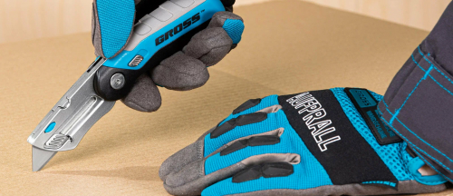 Складной ремонтно-монтажный нож Gross 78882 длиной 175 мм, с трехкомпонентной рукояткой, контейнером-держателем для лезвий и 2 запасными полотнами — режущий инструмент профессионального назначения. Используется для раскройки линолеума и обоев, разрезания картона, гипсокартона, кожи и других материалов. Нож защищен от самопроизвольного раскладывания — на боковой части имеется специальный стопор, фиксирующий держатель лезвия внутри корпуса.