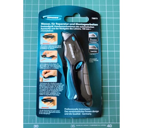 Качественно сделан. Корпус металлический, снаружи резина и пластик. Приятно взять в руки. Два запасных лезвия внутри корпуса в специальном отсеке - не потеряются. Удобно выдвигать лезвие одной рукой с помощью нажатия клавиши на корпусе.