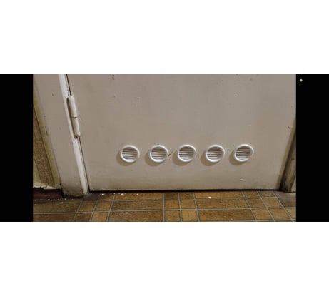 Всем привет! Короче, была плохая вентиляция в ванной комнате советской хрущёвки, высверлил по низу двери 5 сквозных отверстий диаметром 50 мм, а потом долго искал, чем бы закрыть. Да, фланец у этих решёток 47 мм, пришлось тоже сажать на монтажный клей, типа жидких гвоздей, но получилось классно, и в общем то совсем недорого.
