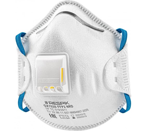 Респиратор RESPIK FFP2 NR D 10шт GX 7020 применяется для защиты от твердых и плохо испаряемых жидких аэрозолей с клапаном выдоха.