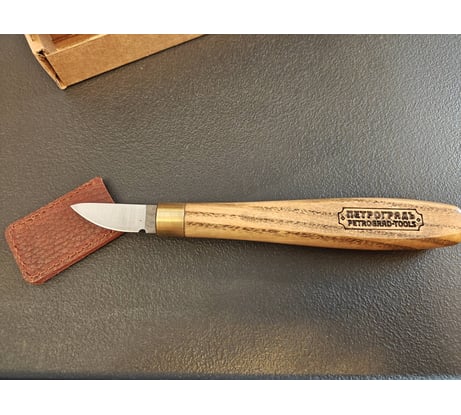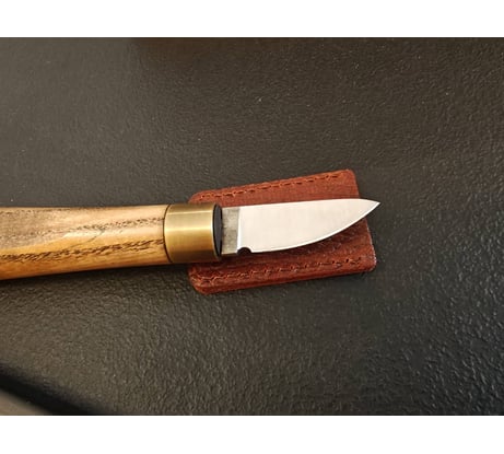 Нож с прямым обухом и изогнутой режущей кромкой отлично подходит как для съёма лишнего материала, так и для финишной работы при резьбе по дереву. Особенностью этой модели является спуск клинка от обуха. Отличный нож как для начинающих, так и для профессионалов.Удобная рукоять из твердых пород древесины. Рукоять покрыта маслом для защиты древесины. Место всада клинка укреплено латунным кольцом и закрыто кожаной вставкой. Аналог ножа для резьбы по дереву "SloydKnife". Все ножи заточены и готовы к работе.