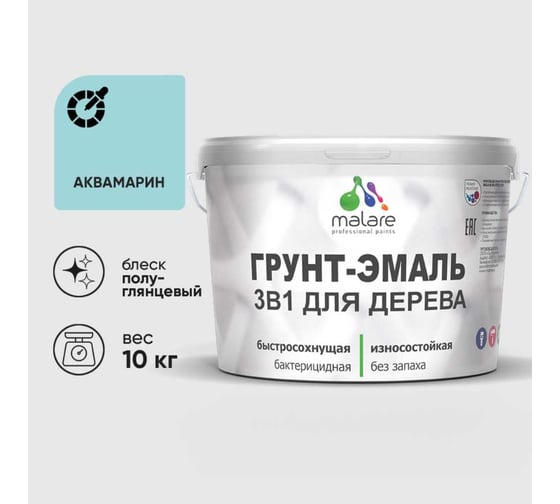 Грунт-Эмаль 3 в 1 для деревянных поверхностей MALARE, резиновая, моющаяся, без запаха, полуглянцевая, аквамарин, 10 кг 4660504704345