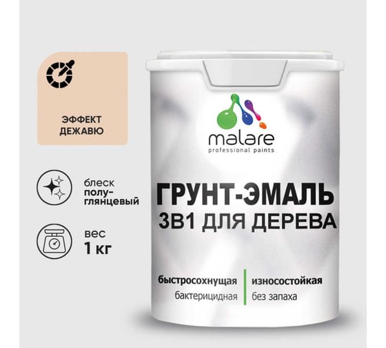 Грунт-Эмаль 3 в 1 для деревянных поверхностей MALARE, резиновая, моющаяся, без запаха, полуглянцевая, эффект дежавю, 1 кг 4660504707292