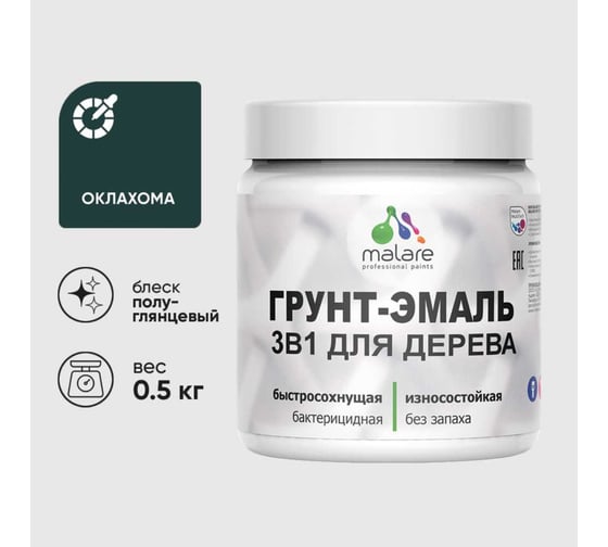 Грунт-Эмаль 3 в 1 для деревянных поверхностей MALARE, резиновая, моющаяся, без запаха, полуглянцевая, оклахома, 0.5 кг 4660504705960
