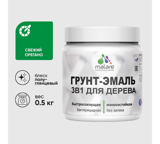 Грунт-Эмаль 3 в 1 для деревянных поверхностей MALARE, резиновая, моющаяся, без запаха, полуглянцевая, свежий орегано, 0.5 кг 4660504706523