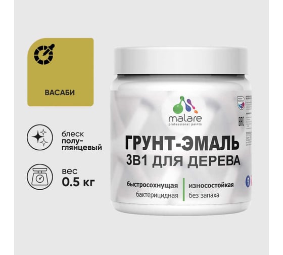 Грунт-Эмаль 3 в 1 для деревянных поверхностей MALARE, резиновая, моющаяся, без запаха, полуглянцевая, васаби, 0.5 кг 4660504704765