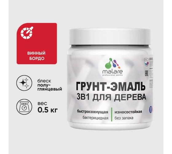 Грунт-Эмаль 3 в 1 для деревянных поверхностей MALARE, резиновая, моющаяся, без запаха, полуглянцевая, винный бордо, 0.5 кг 4660504704925