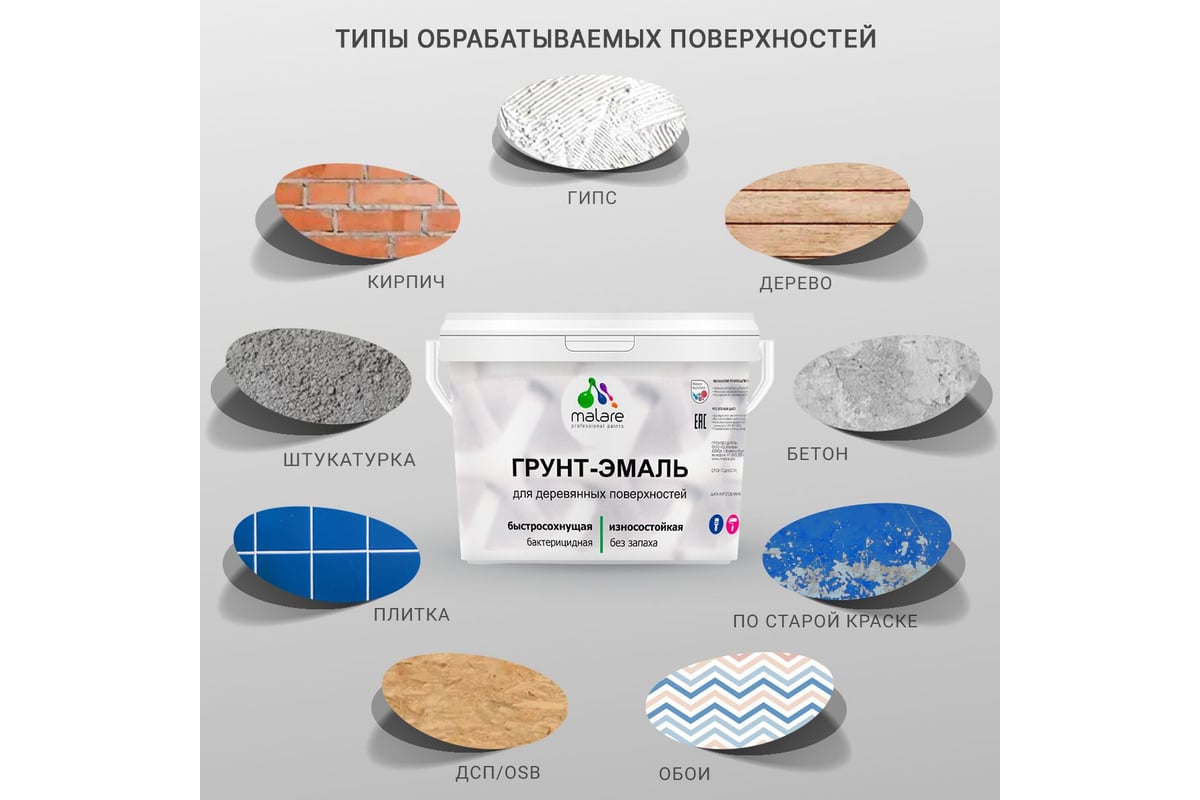 Грунт-Эмаль 3 в 1 Malare для деревянных поверхностей. Специализированная краска-антисептик с добавлением воска для защитно-декоративного окрашивания любых деревянных поверхностей, как фасадных, так и интерьерных. Состав не только защищает древесину от атмосферных факторов, но и пропитывает и грунтует его, создавая прочное декоративное покрытие.