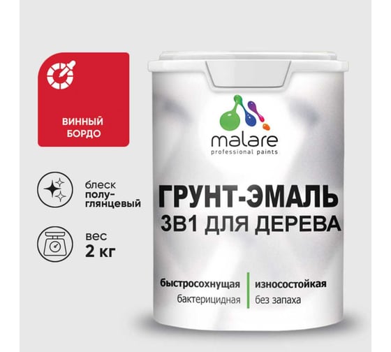 Грунт-Эмаль 3 в 1 для деревянных поверхностей MALARE, резиновая, моющаяся, без запаха, полуглянцевая, винный бордо, 2 кг 4660504704956