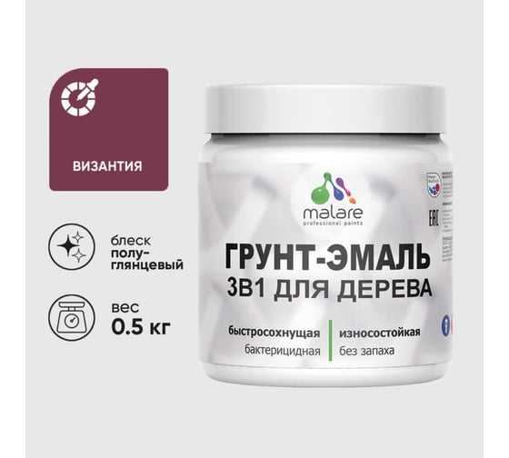 Грунт-Эмаль 3 в 1 для деревянных поверхностей MALARE, резиновая, моющаяся, без запаха, полуглянцевая, византия, 0.5 кг 4660504704888