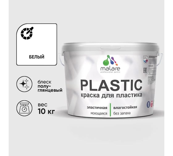Резиновая краска для пластика MALARE Plastic для ПВХ, для подоконников и откосов, без запаха, полуглянцевая, белый, 10 кг 4660504716645