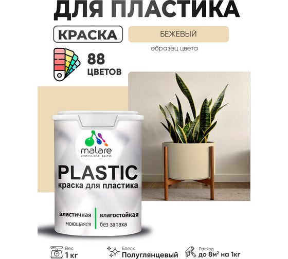 Резиновая краска для пластика MALARE Plastic для ПВХ, для подоконников и откосов, без запаха, полуглянцевая, бежевый, 1 кг 4660504716591