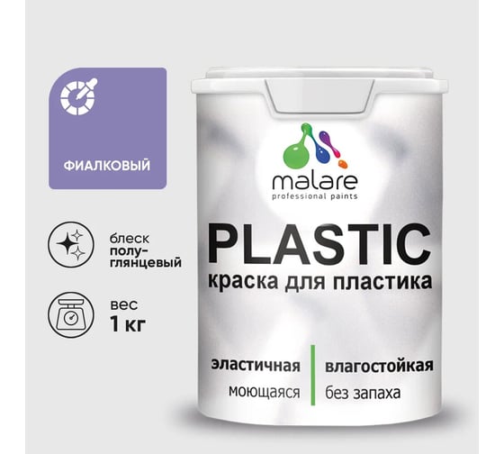 Резиновая краска для пластика MALARE Plastic для ПВХ, для подоконников и откосов, без запаха, полуглянцевая, фиалковый, 1 кг 4660504719073